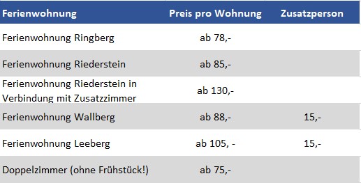 Preise in EUR pro Wohnung ohne Verpflegung inkl. TegernseeCard, zuzüglich Kurbeitrag 3,- €/Tag und Person,